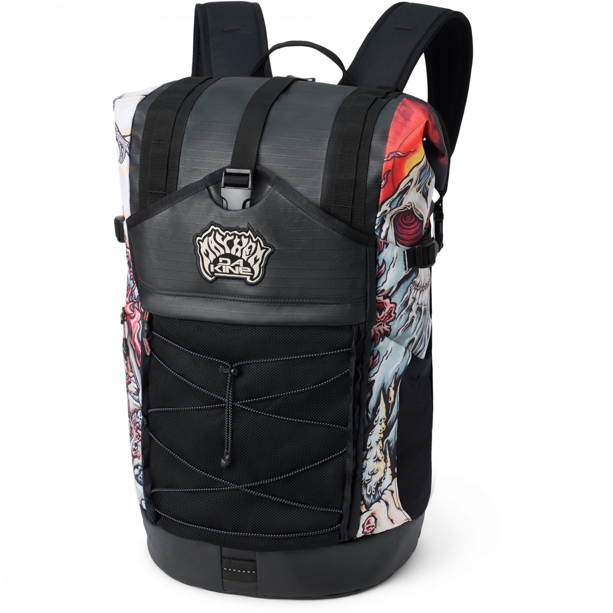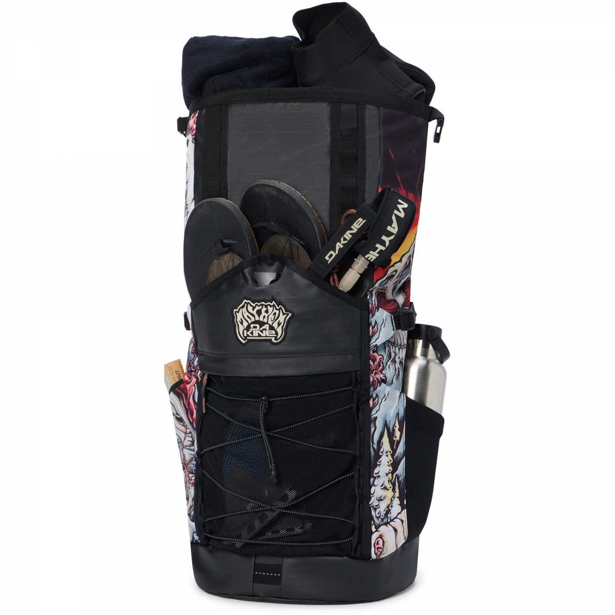 Рюкзак Mission Surf DLX Wet/Dry Rolltop 35L — идеальный компаньон для сёрфинга. Результат коллаборации Dakine и Mayhem (Matt Biolos) с иллюстрациями художника Drew Brophy в характерном рисованном стиле.